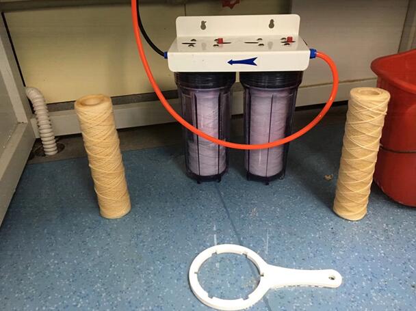 現(xiàn)場(chǎng)發(fā)揮穩(wěn)定的第三步:關(guān)閉自來(lái)水龍頭,抄起八角塑料扳手就開始擰前端預(yù)處理組件,先逆時(shí)針方向扭動(dòng)(激動(dòng)的心情應(yīng)搭配一瓶紅牛),發(fā)現(xiàn)我一個(gè)人搞不定的時(shí)候,王博士二話不說(shuō)就過來(lái)幫忙,齊心協(xié)力一次完成(非常感謝他)。有了順利的開始,接下來(lái)的Progard預(yù)純化柱、Quantum 精純化柱、水箱空氣過濾器也都順利完成更換。