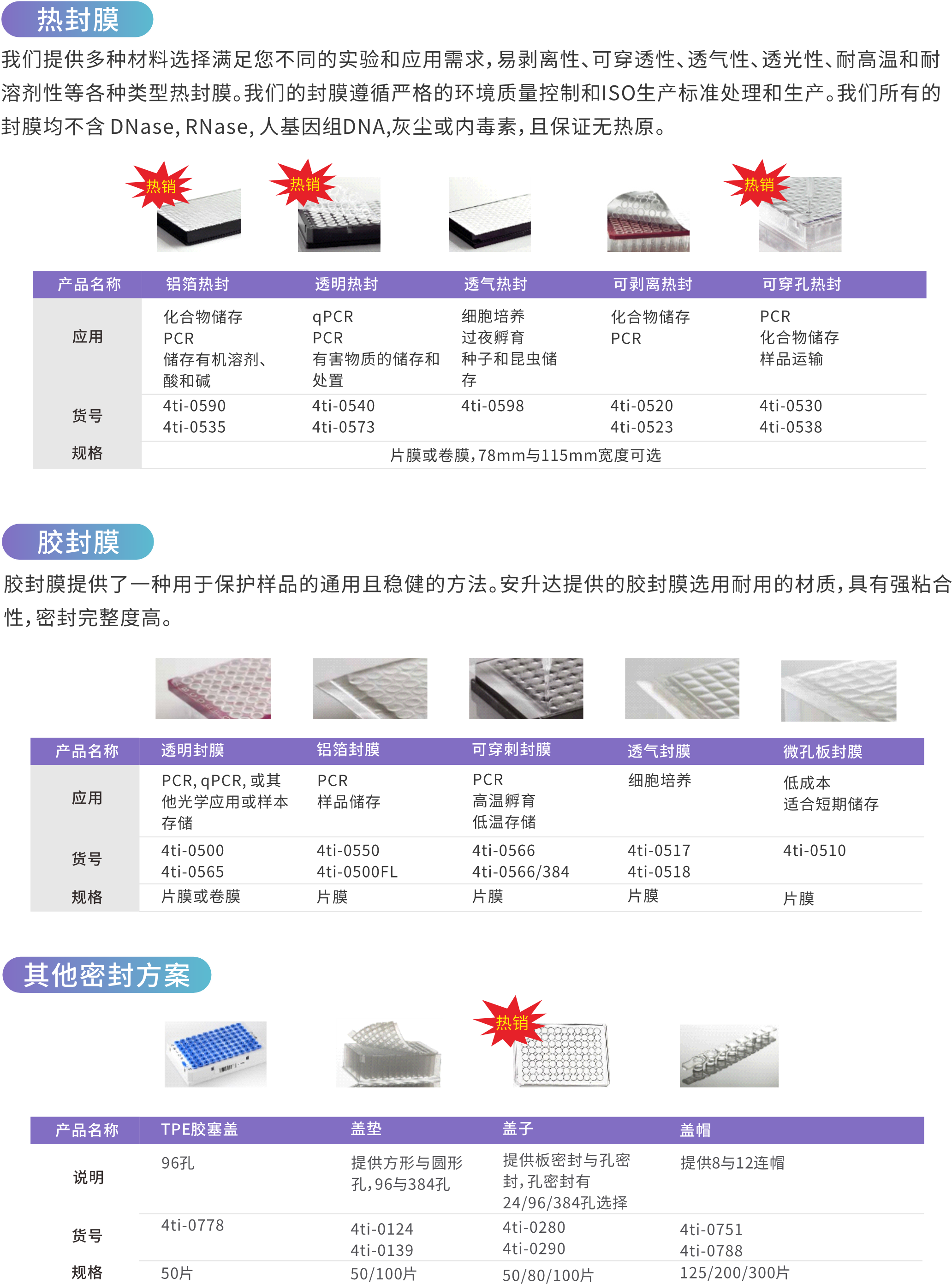 我們提供多種材料選擇滿足您不同的實驗和應(yīng)用需求,易剝離性、可穿透性、透氣性、透光性、耐高溫和耐溶劑性等各種類型熱封膜。我們的封膜遵循嚴格的環(huán)境質(zhì)量控制和ISO生產(chǎn)標準處理和生產(chǎn)。我們所有的封膜均不含DNase,RNase,人基因組DNA,灰塵或內(nèi)毒素,且保證無熱原。